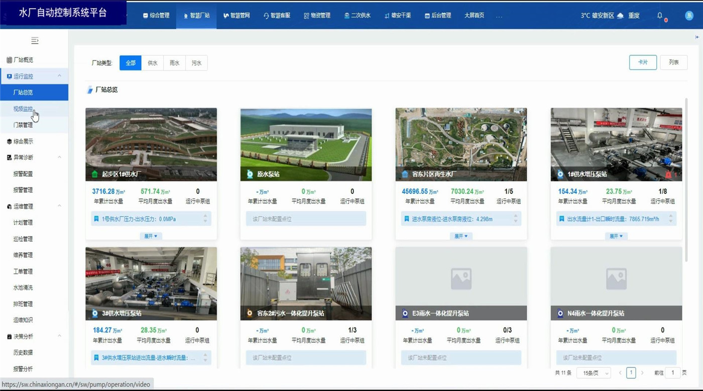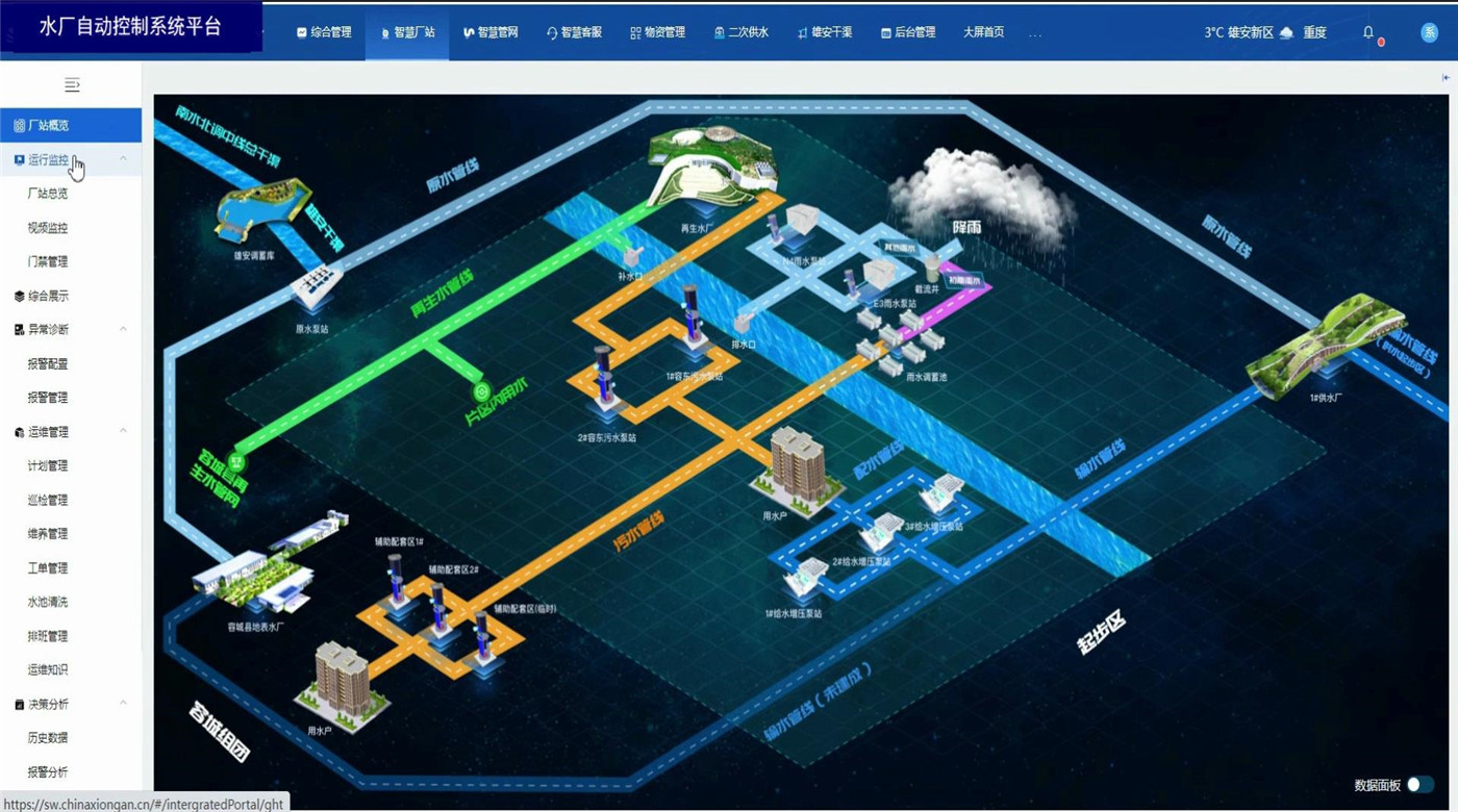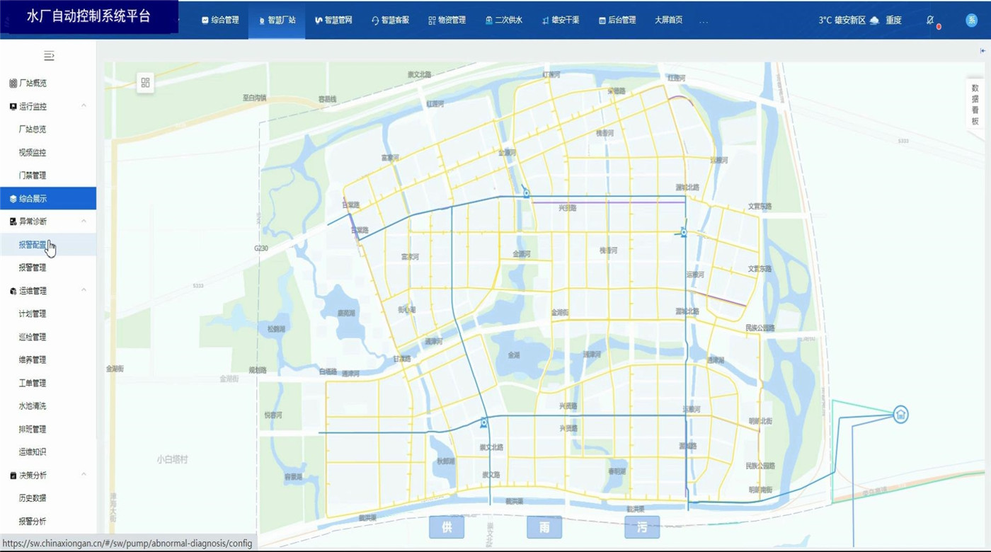 水厂自动控制系统平台基于B/S结构(浏览器、服务器模式),通过在电脑上使用浏览器登录平台账号,即可实时监控厂站运行数据和相关图表报告。同时具备视频监控、门禁管理,异常数据报警,厂站巡检、设备定期养护功能。具备设备地图定位显示,历史监测数据信息的查、下载和统计分析。利用智能算法评估实时监测数据,在管网异常情况下及时进行风险报警。