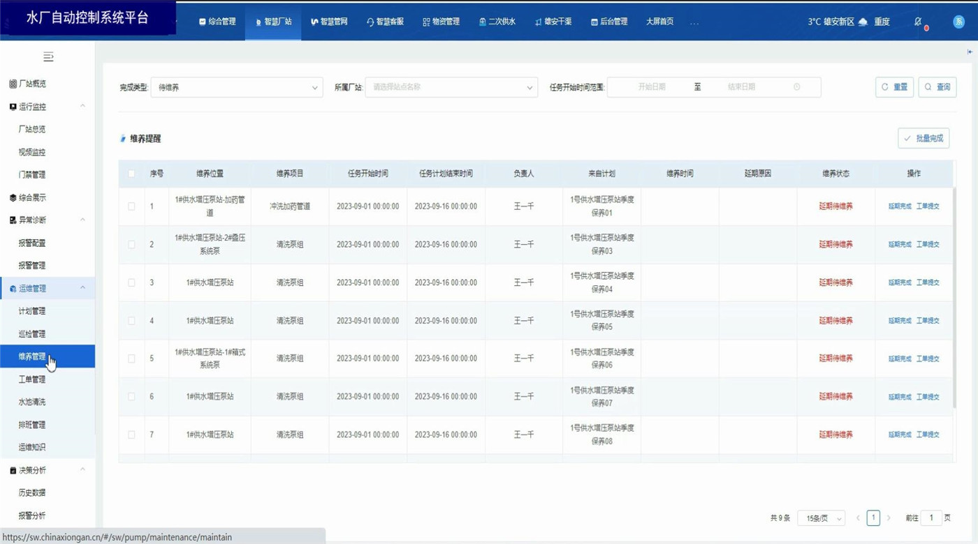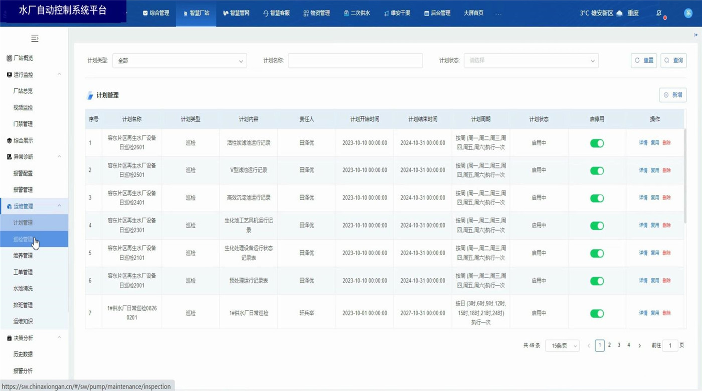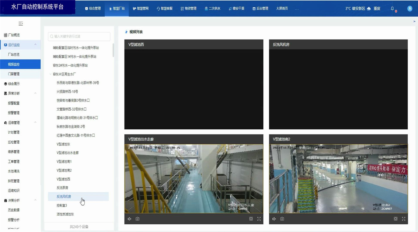 水厂自动控制系统平台基于B/S结构(浏览器、服务器模式),通过在电脑上使用浏览器登录平台账号,即可实时监控厂站运行数据和相关图表报告。同时具备视频监控、门禁管理,异常数据报警,厂站巡检、设备定期养护功能。具备设备地图定位显示,历史监测数据信息的查、下载和统计分析。利用智能算法评估实时监测数据,在管网异常情况下及时进行风险报警。