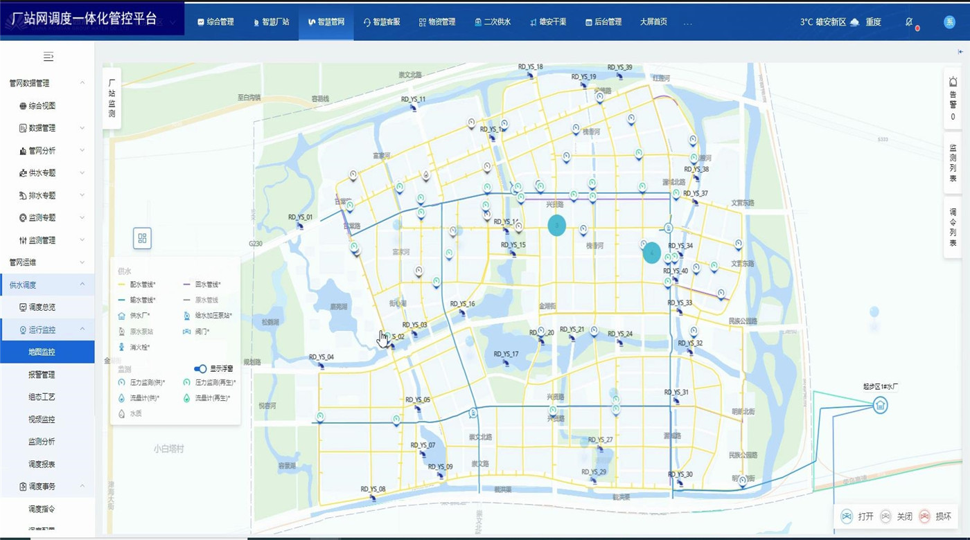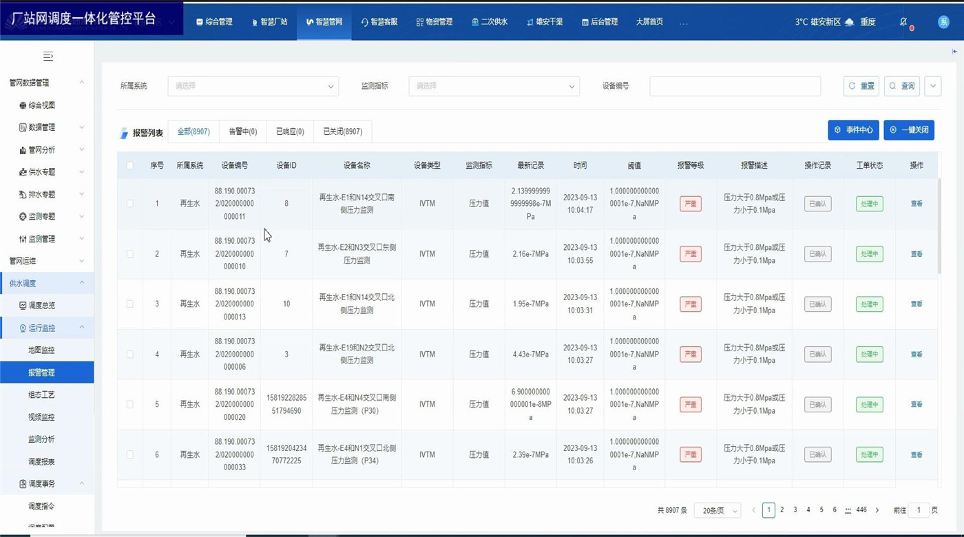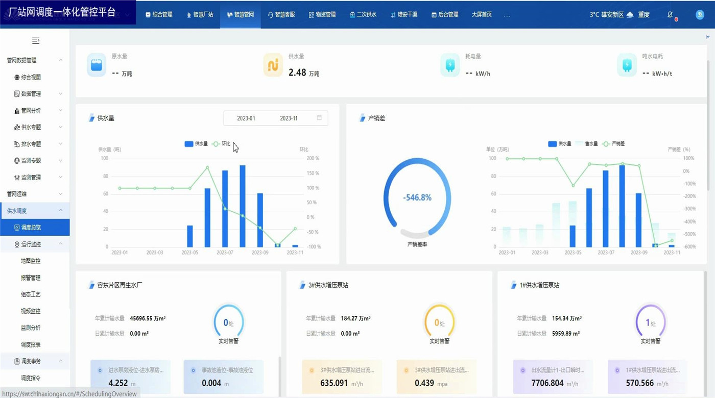 厂站网调度一体化管控平台为水务企业各级领导和调度人员以及水厂工作人员提供总体运行情况和关键的实时数据。展示内容包括水厂、泵站等厂站的供水量、产销差、进出水流量、液位、压力等关键数据,水厂泵站视频监控,设备阈值报警,监测数据分析,调度报表管理等。方便调度员一眼掌握当前调度策略对实时数据的影响,及时观察关键数据并作出临时调整。