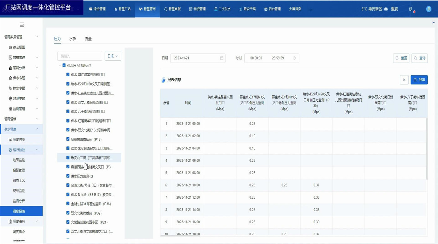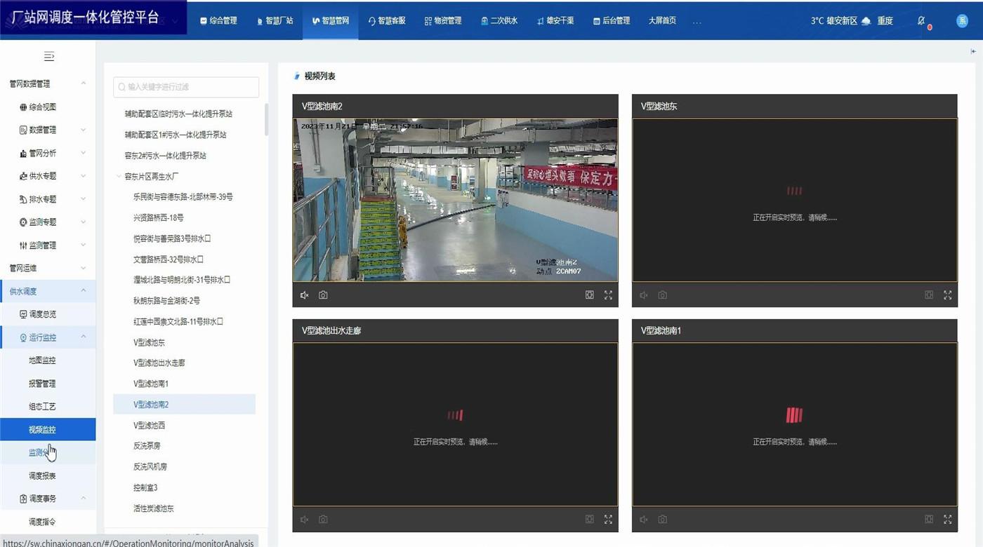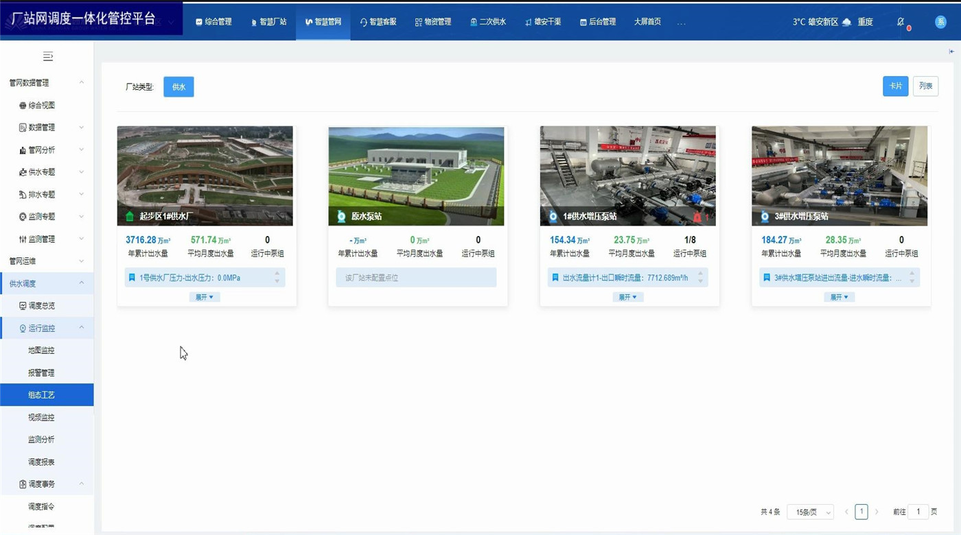 厂站网调度一体化管控平台为水务企业各级领导和调度人员以及水厂工作人员提供总体运行情况和关键的实时数据。展示内容包括水厂、泵站等厂站的供水量、产销差、进出水流量、液位、压力等关键数据,水厂泵站视频监控,设备阈值报警,监测数据分析,调度报表管理等。方便调度员一眼掌握当前调度策略对实时数据的影响,及时观察关键数据并作出临时调整。