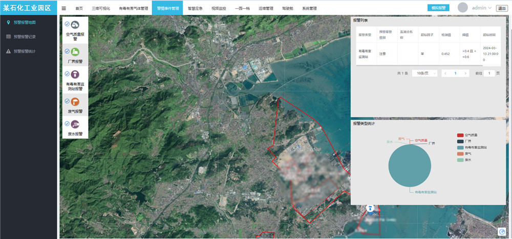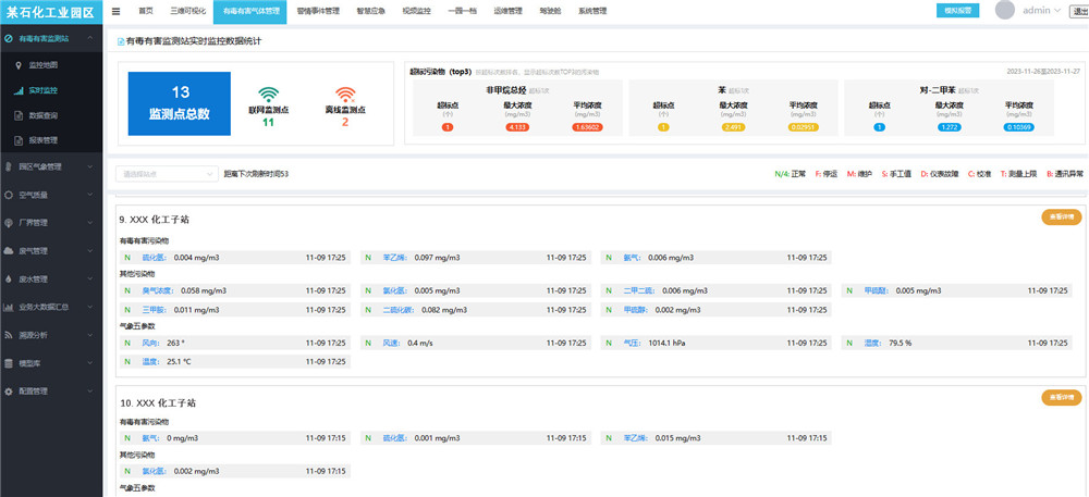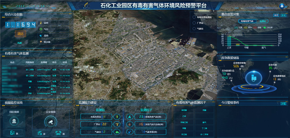 有毒有害气体环境风险预警平台通过采集部署在园区监测站点的一系列光谱、气相色谱-质谱联用仪等高精度气体分析仪器,实时监测园区CO, CO2, H2S、HCl、氨气、TVOC(苯乙烯)、甲硫醇、甲硫醚、非甲烷总烃、甲苯二甲苯等多个风险因子。对园区重点监测点,危险气体浓度进行实时监控,对污染指标趋势进行预测报警。依托物联网、大数据和人工智能等先进技术构成的化工园区有毒有害易燃气体监测预警系统,实现了园区环境内各气体的实时信息的在线采集、数据显示、数据多维模型分析,污染趋势分析和预警。相比传统人工巡检的高误差率,有毒有害气体环境风险预警平台管理有效降低了化工园区的环境风险发生等级,提升了安全生产管理水平。